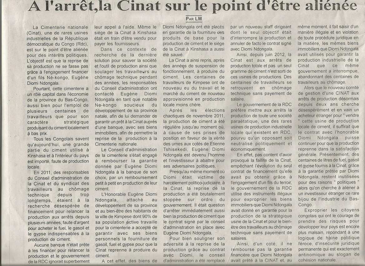 Alors que le nouveau comité de gestion d’une CINAT aux arrêts de production désormais depuis deux ans cherche désespérément et en vain un acheteur étranger pour « vendre » cette usine de production locale de ciment, il suffirait que le contrat avec l’honorable Diomi Ndongala puisse continuer pour que la production reprenne dans la satisfaction générale. Présentement, des centaines de litres de fuel, gasoil et gypse fournis à la Cinat, grâce à la garantie prêtée par Diomi Ndongala, restent inutilisées pour des raisons « politiques » alors qu’on cherche à aliéner à un investisseur étranger ce rare bijou de l’industrie du Bas-Congo.