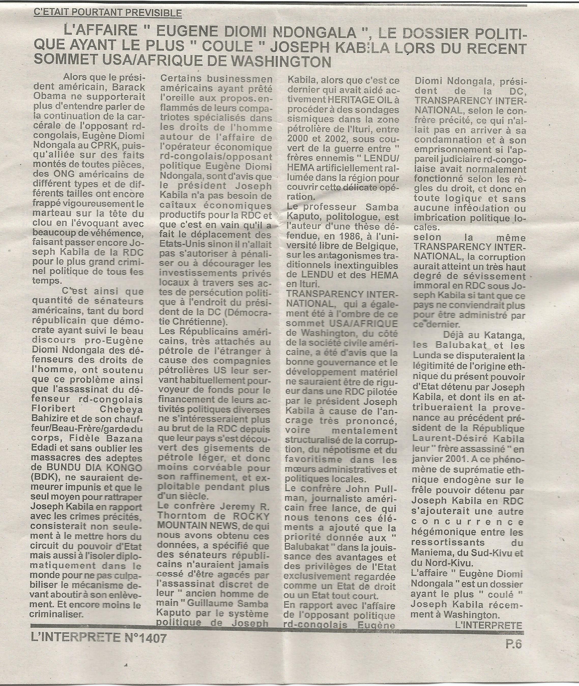 L’AFFAIRE « EUGENE DIOMI NDONGALA », LE DOSSIER POLITIQUE AYANT LE PLUS « COULE’ » JOSEPH KABILA LORS DU RECENT SOMMET USA/AFRICA DE WASHINGTON – JOURNAL INTERPRETE DU 08/08/2014