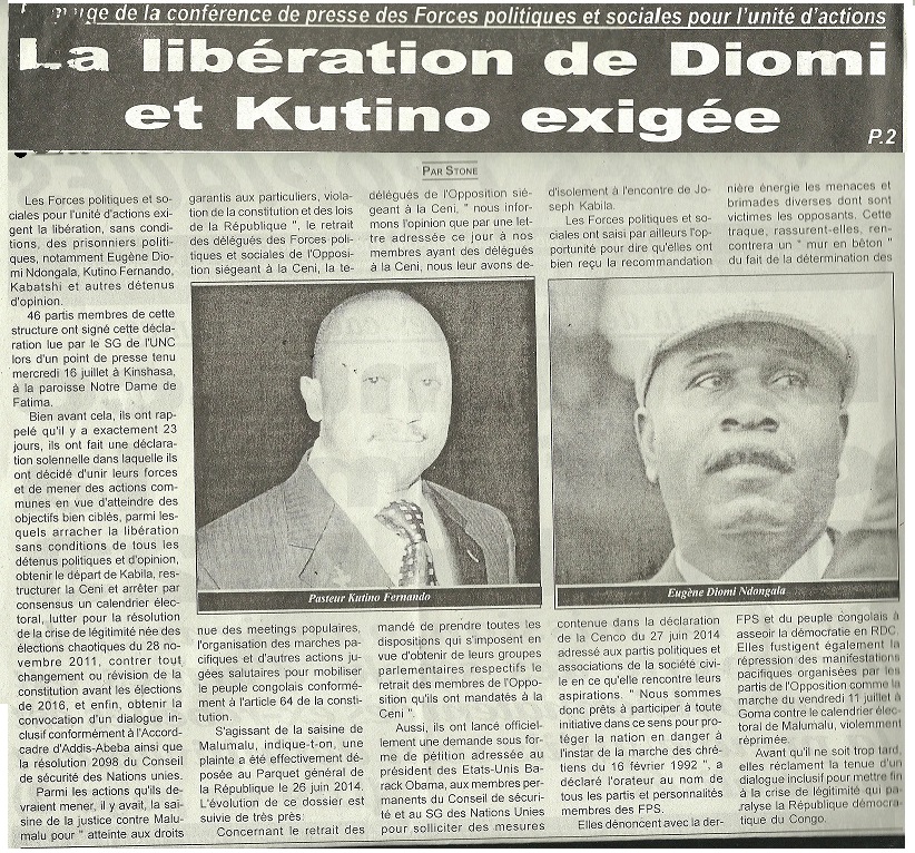 Les Forces politiques et sociales exigent la libération de Diomi, Kutino, Kabatshi